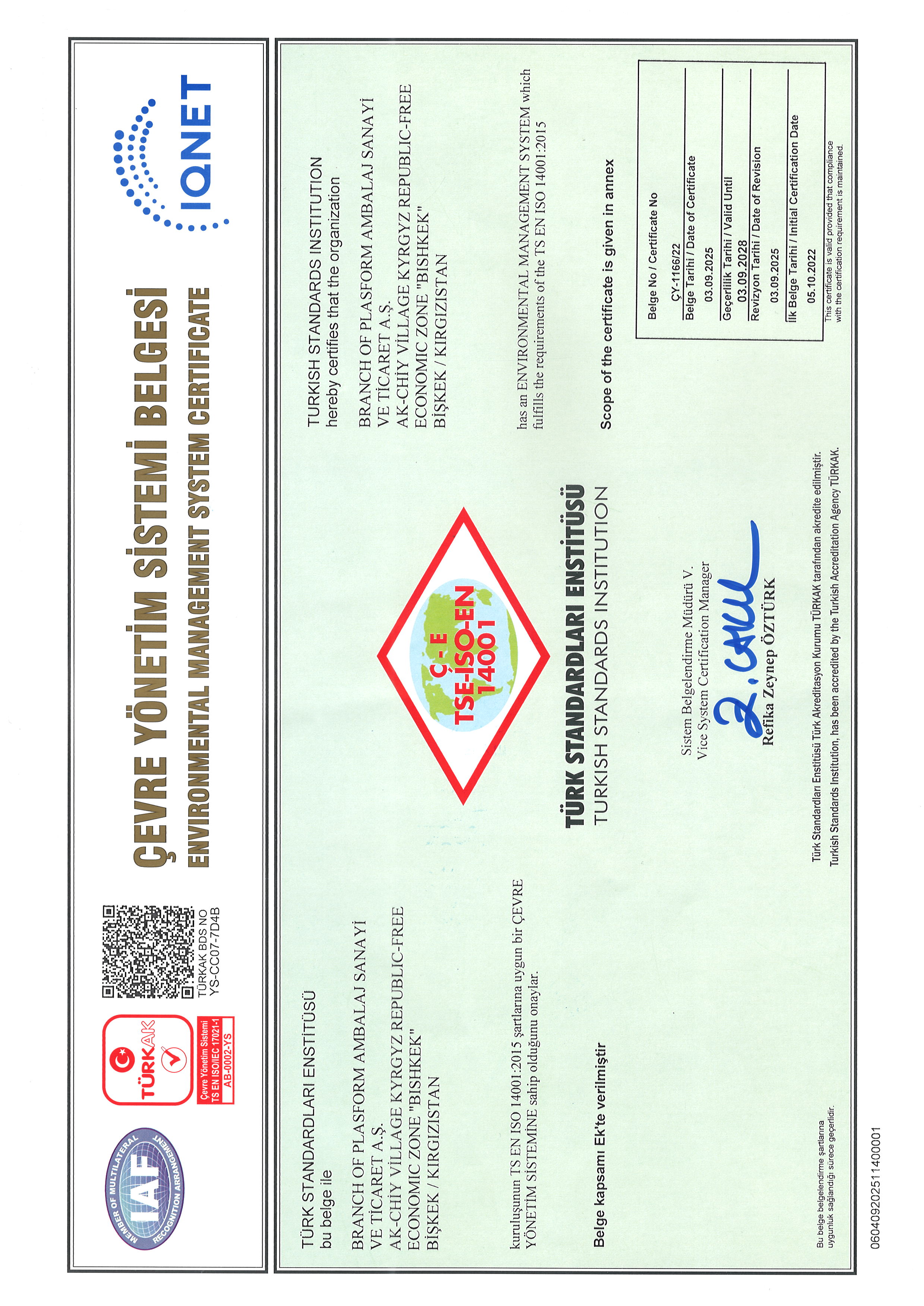 соответствующую требованиям TS EN ISO 14001:2015.